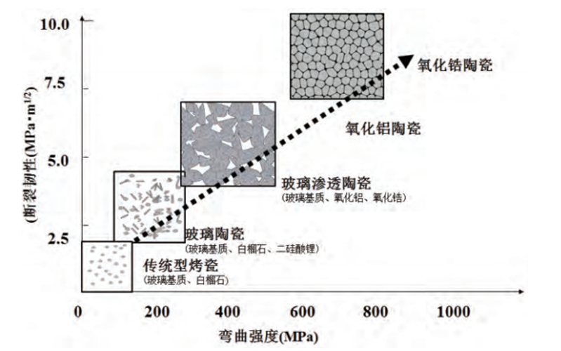 圖1 常見口腔陶瓷材料的結構與力學性能比較